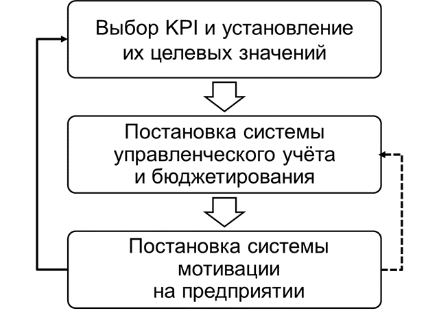 Але як задовольняються ці три умови? Виконання цих трьох умов у сучасних умовах бізнес-середовища досягається побудовою дієвої системи управління компанією, заснованої на «жорстких» методах. "Жорсткі" методи - це методи оцифровані, коли керувати бізнесом потрібно з позиції: 1) постановки цілей, 2) оцифрування цілей, 3) аналізу того, наскільки вона досягається. Послідовність постановки системи управління підприємством з урахуванням «жорстких» методах проілюстрована малюнку 1.