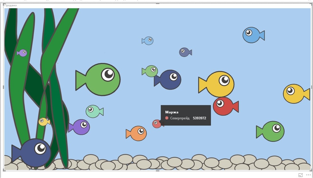Розмір кожної рибки відповідає розміру маржі, яку заробили на конкретному клієнті. Сюди ж можна ставити виручку, прибуток, показувати менеджерів або регіони